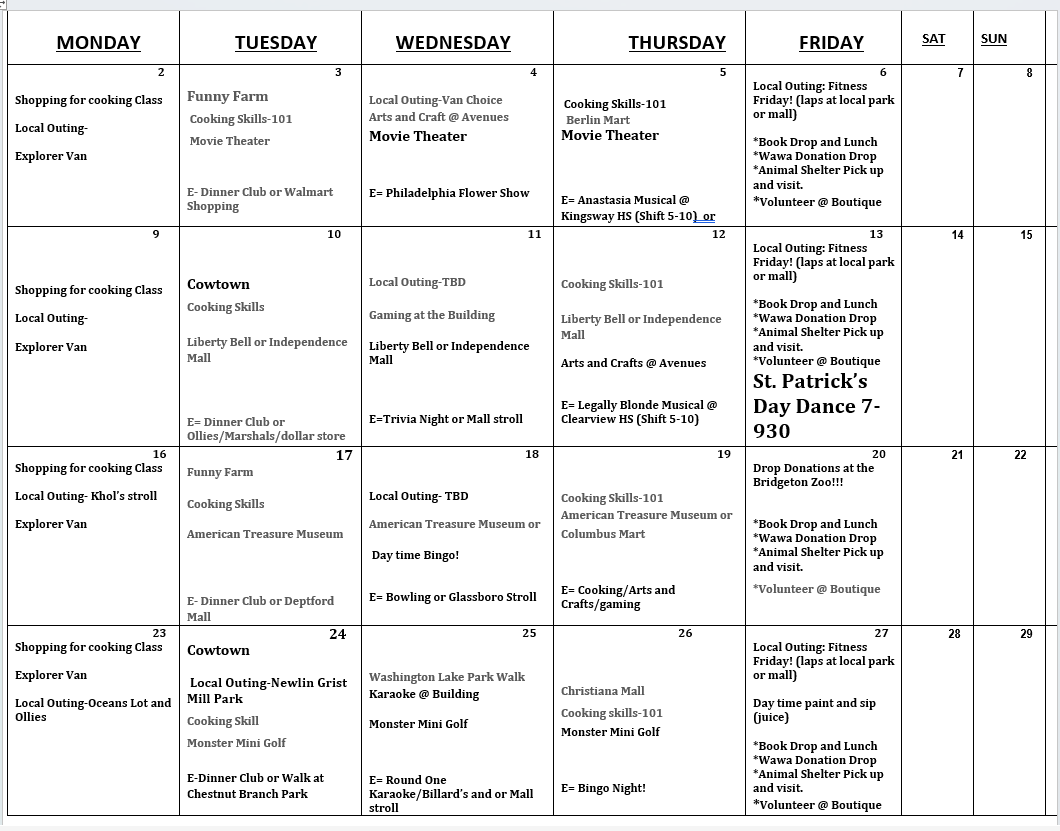 Info sheets for March will be posted shortly. Calendar is below!